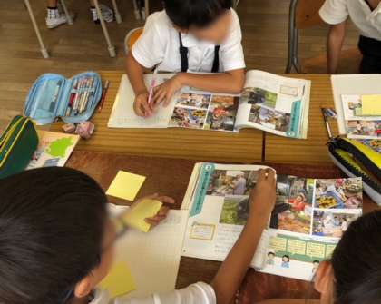 グループで調べてまとめる活動をしています。見つけたことを付箋に書いて話し合いをします。