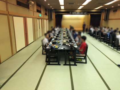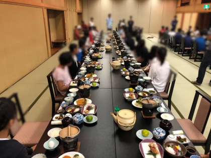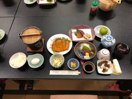 夕食の時間です。すき焼き鍋もあります。みんなでいただきま〜す。