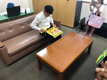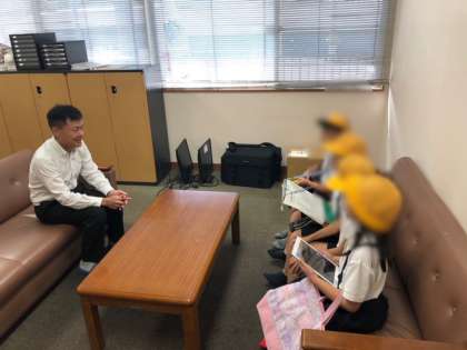 ともしび苑の方にインタビューをしました。お手紙と新らしい110番の旗を渡しました。