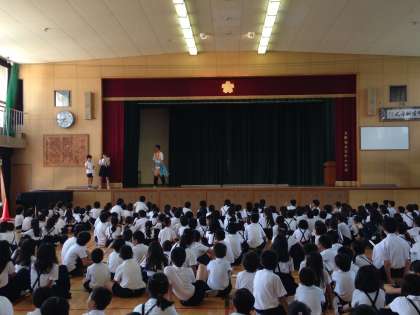 一学期最後の集会は「変装している先生はだれだ?」です。