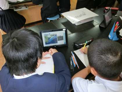 屋上で雲の動きを見たり、教室でタブレットを使って調べたりしました。