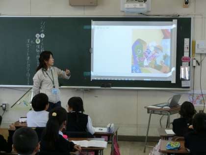 5時間目が始まるまでのわずかな時間ですが、英語に親しむ活動をしています。