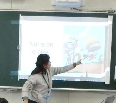 先生と一緒に電子教材を見て、声に出して、練習しています。