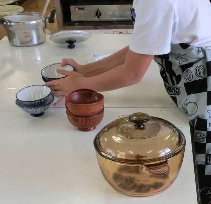 5年生家庭科です。今日は味噌汁とご飯を作ります。