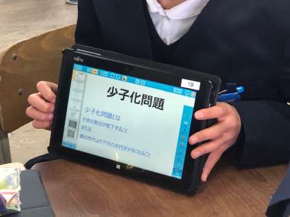 グループでの話し合いでは、タブレットを使って説明しました。いろいろな意見が出て、もう一度話し合うことになりました。