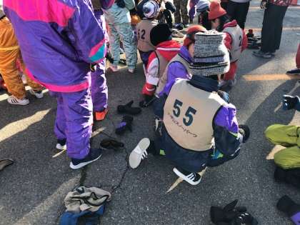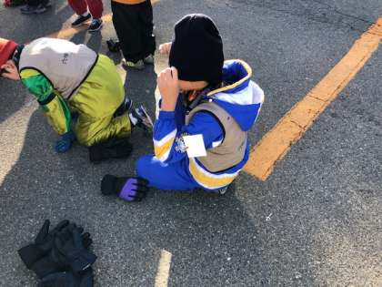 ゼッケンをつけて準備しています。空気はひんやりしていますが、天気は晴れです。