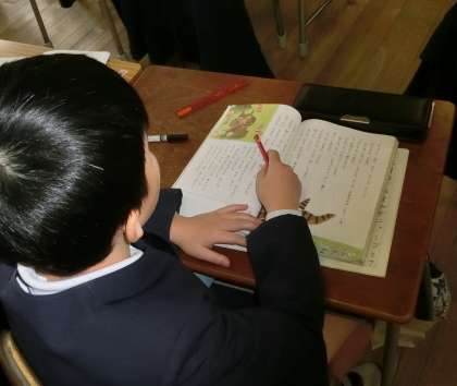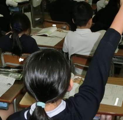 2年生は国語の時間に、「ニャーゴ」というお話を読んでいます。ネズミとネコの楽しいセリフのやり取りや、気持ちの変化が面白い作品です。みんなで、いろいろな意見を出し合って、話し合いをしています。