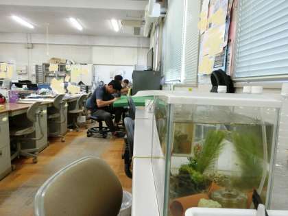 理科室にいたメダカたちは、夏休み期間中は職員室にいます。
