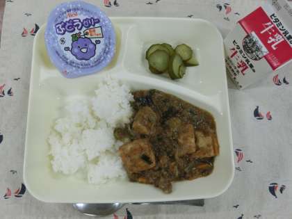 8月28日の給食は「マーボーあつあげ丼、きゅうりの中華あえ、ぶどうゼリー」でした。マーボーあつあげ丼は、毎年8月に出るメニューです。しょうが、にんにく、豆板醤、ひき肉、にんじん、たまねぎ、なす、にらをいため、しょうゆやみそで味つけしています。ボリュームを出すために、厚揚げを加えるのがポイントです。とても美味しくご飯が進みます。お家でもお試しください!