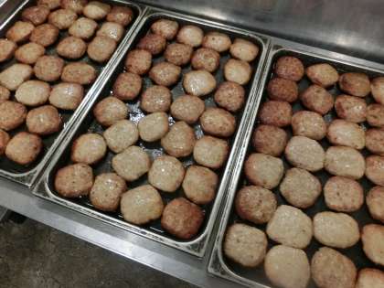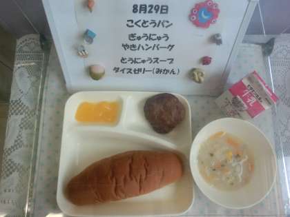 今日の給食は「焼きハンバーグ、豆乳スープ、ダイスゼリー(みかん)」でした。焼きハンバーグは、給食室にある焼き物機(オーブン)で焼いています。豆乳スープは、じゃがいも、キャベツ、たまねぎ、コーン、にんじん、パセリと具だくさんでした。ゼリーは冷たくてみんな大喜びでした。
