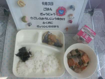 9月3日の給食は「ごはん、牛乳、さごしのおろしじょうゆかけ、含め煮、牛ひじきそぼろ」でした。牛ひじきそぼろは、牛ひき肉、もどしたひじきを炒め、砂糖、みりん、しょうゆで味つけし、粗みじんに切ったしそを加えています。ごはんによく合い、好評でした!