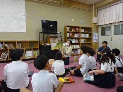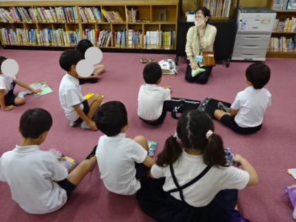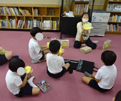 図書館司書の大谷先生に「みんなおそろい」「ぽんちんぱん」「おべんとうなあに」の読み聞かせをしてもらいました。みんな興味津々で絵本を見つめ、ぽんちんぱんでは「ぽん」に合わせて手をたたきました。ハンカチを使った手遊びも体全体を使って楽しんで行っていました。
