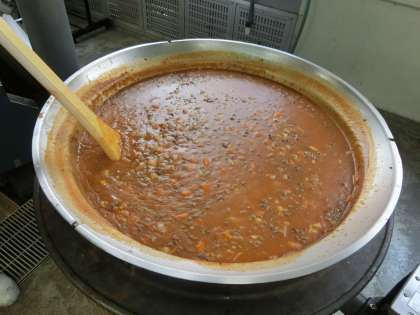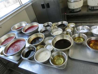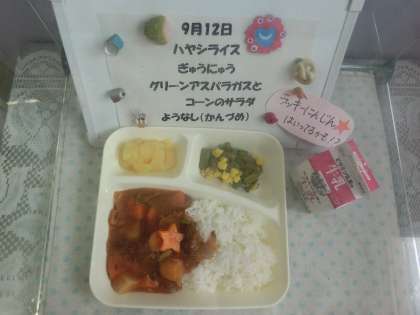 9月12日の給食は「ハヤシライス、グリーンアスパラガスとコーンのサラダ、洋なし(缶)」でした。ハヤシライスには、ケチャップ、トマトピューレ、砂糖、塩、こしょう、ローレル、トンカツソース、ウスターソース、こいくちしょうゆ、チキンブイヨンが使われています。そして、小麦アレルギーの人も食べることができるように小麦粉を使わず、米粉でとろみをつけています。給食のハヤシライスはとても好評です!