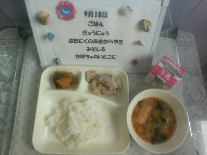 9月18日の給食は「ごはん、牛乳、豚肉の甘辛焼き、みそ汁、かぼちゃのいとこ煮」でした。いとこ煮は、かたくて時間のかかる材料から順に「おいおい」入れて煮ることから、「いとこ」を表す「甥と甥」の言葉に合わせて「いとこ煮」と呼ばれるようになったといわれています。