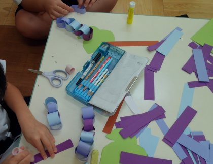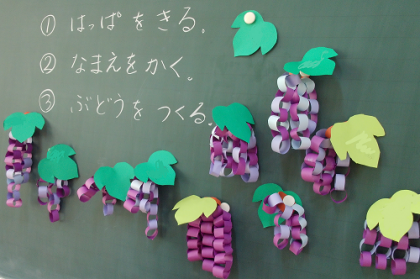 画用紙でぶどうを作りました。3色の画用紙を組み合わせる児童もいれば、紫色1色で作る児童、きれいに2色を組み合わせる児童など、様々でした。