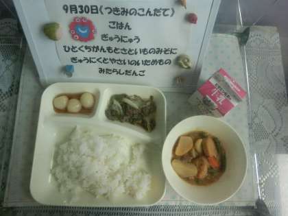 9月30日の給食は月見の行事献立で「ご飯、牛乳、一口がんもとさといものみそ煮、牛肉と野菜のいためもの、みたらしだんご」でした。十五夜が「芋名月」と言われることや十五夜にさといもを供える習慣があることから、さといもを使った煮物でした。今年は10月6日が十五夜だそうです。みそ味の煮物がおいしく「このみそ味作った人、尊敬する!」という子どもがいました。
