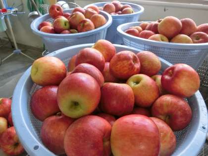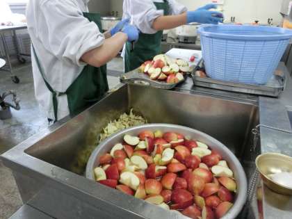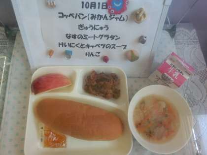 10月1日の給食は「コッペパン(みかんジャム)、牛乳、なすのミートグラタン、鶏肉とキャベツのスープ、りんご」でした。りんごがおいしくなり、給食にもりんごが出ました。食べやすいように、芯を取ってもらっています。