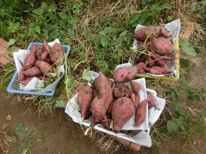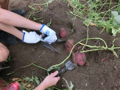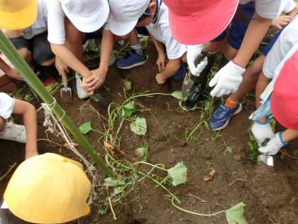 10月15日に、学習園でいもほりをしました。伸びていたツルをはさみで切って、スコップで丁寧に掘っていくと、立派なさつまいもがたくさん!おいしいさつまいもだといいですね。