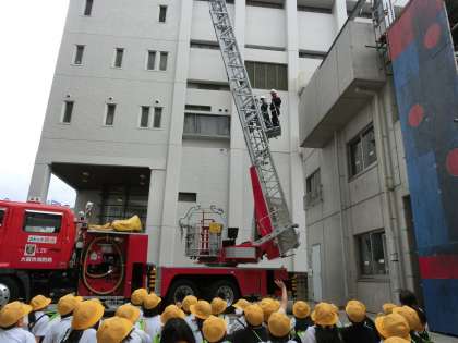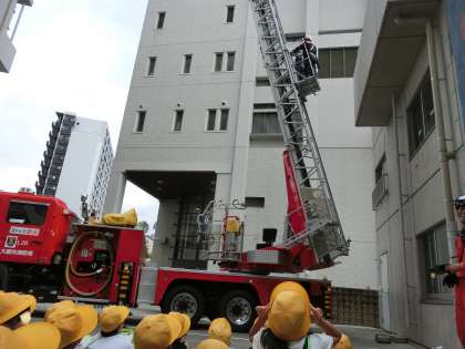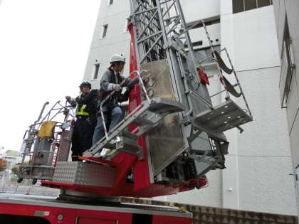はしご車に先生が乗り、地上40メーター付近まで上昇し、