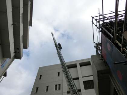 はしご車に先生が乗り、地上40メーター付近まで上昇し、
