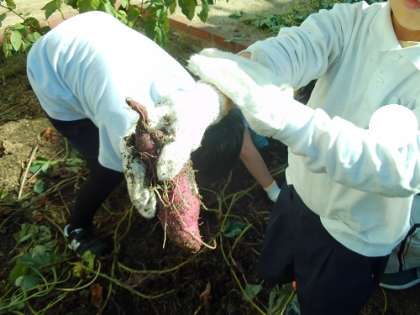 ひまわり学習園で育てていたさつまいもを収穫しました。土の中深くに埋まっていて、取り出すのが大変でしたが、異学年で協力しながら掘ることができました。みんなの中も深まるいい芋ほり体験ができました!