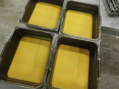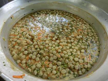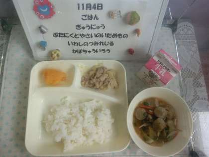 11月4日の給食は「ごはん、牛乳、豚肉と野菜のいためもの、いわしのつみれ汁、かぼちゃういろう」でした。つみれ汁は、いわしだんごの他にだいこんやにんじん、ごぼうなどが入っていました。ういろうは米粉、砂糖、水、かぼちゃのペーストを混ぜ合わせ、蒸して作っています。ほどよい甘さのおいしいデザートでした。