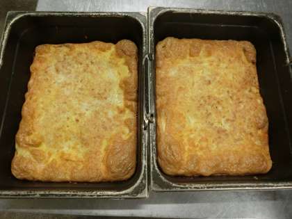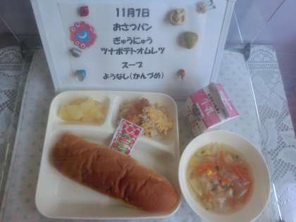 11月7日の給食は「おさつパン、牛乳、ツナポテトオムレツ、スープ、洋なし(缶)」でした。ツナポテトオムレツは、卵にツナ、ゆでたじゃがいもを加えて焼き物機で焼いています。年1回の献立で、とても好評でした。