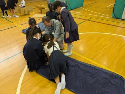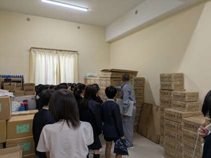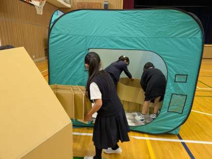 防災教室で区役所の方に来ていただき、段ボールベッドを組み立てたりトランシーバーの使い方を教えていただいたりしました。また、備蓄倉庫の見学もして、何がどのくらい学校にはあるのか教えていただきました。これからも災害に備えてできることを考えていってください。