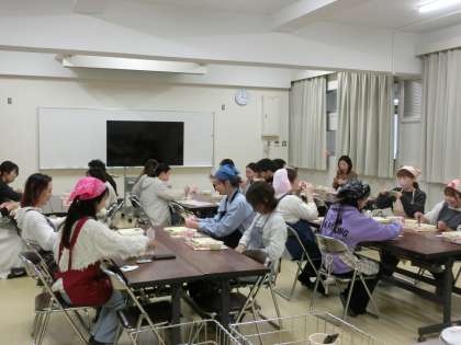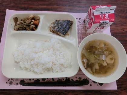 11月26日はPTA学校給食試食会が行われました。献立は「ごはん、牛乳、さごしのごまじょうゆ焼き、五目汁、大豆の煮もの」でした。この献立は「まごわやさしい」献立といわれるものです。頭文字をとって、ま:豆、ご:ごま、わ:わかめ(海そう)、や:やさい、さ:さかな、し:しいたけ(きのこ)、い:いも、を表しています。参加されていた保護者の皆様からも、とてもおいしく体に良い献立、と好評でした。