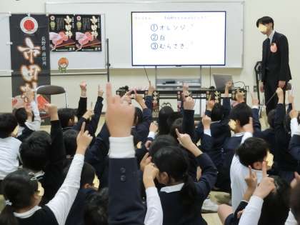 長野県の紹介、紙芝居、クイズ、最後に市田柿の試食をしました。