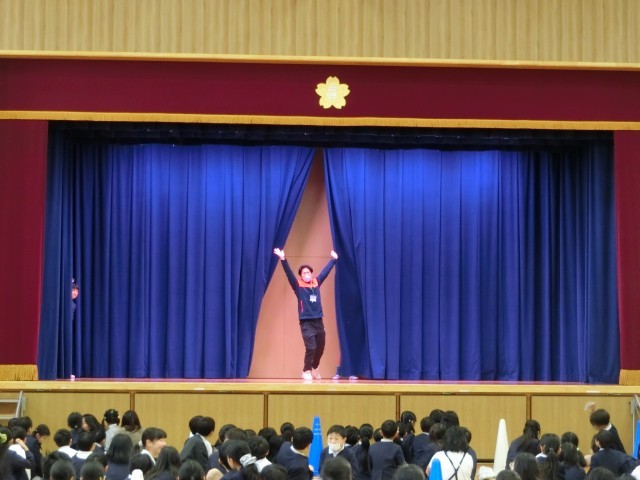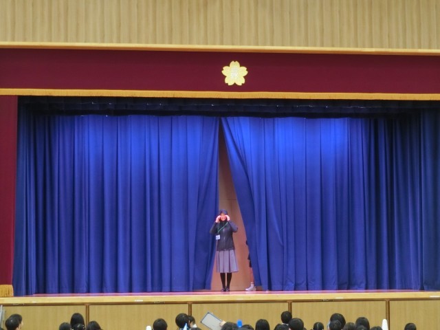カーテンの後ろで隠れている先生に、集会委員がいくつかの質問をします。