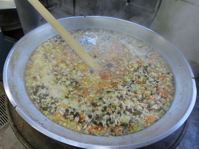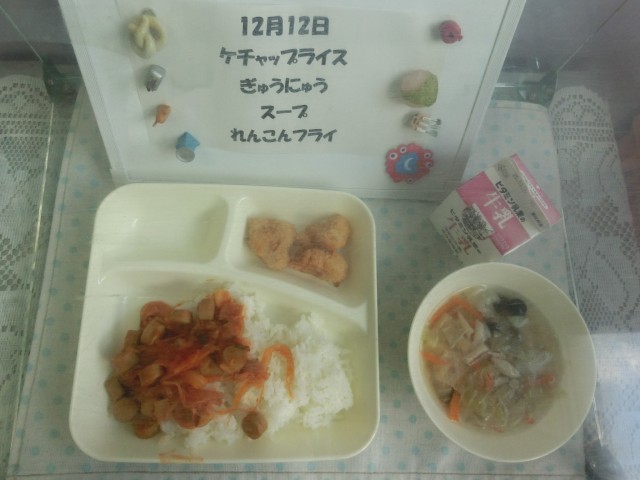 12月12日の給食は「ケチャップライス、牛乳、スープ、れんこんフライ」でした。ケチャップライスは、ベーコン、ウインナー、たまねぎ、ピーマンをケチャップで炒めて、ごはんにかけて混ぜていただきます。とても好評でした。スープは鶏肉、キャベツ、にんじん、えだまめ、コーン、しめじが入った具だくさんの汁物でした。れんこんフライは、外はカリッと、中はもっちりの食感でした。