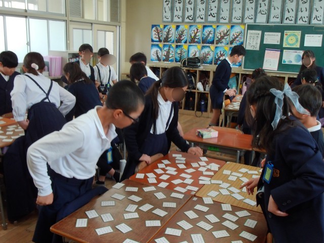 国語科で百人一首をしました。冬休みにたくさん覚えて、2学期にした時よりも、上の句を詠んだだけで、下の句を取っている児童がたくさんいました。「〇まい取れた!」と白熱していました。