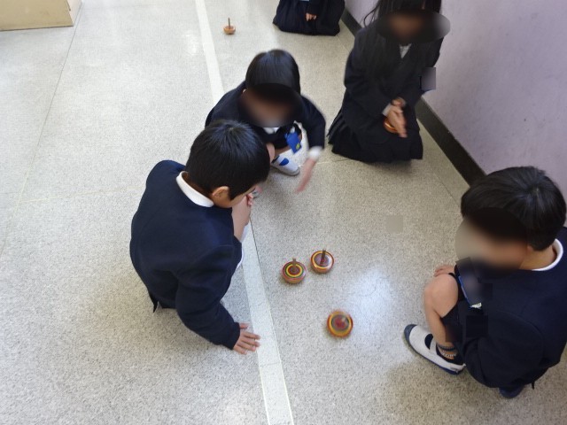 生活科で昔から伝わる遊びをしています。「お手玉」「けん玉」「こま」「だるまおとし」などの遊びがあります。友だちとコツを教え合いながら活動しています。