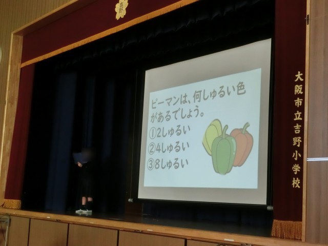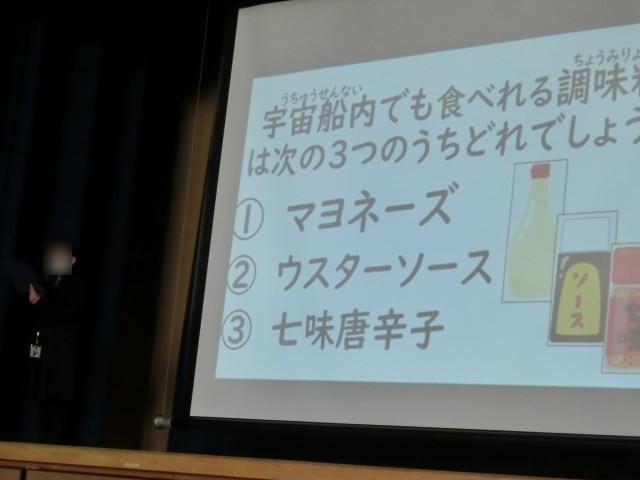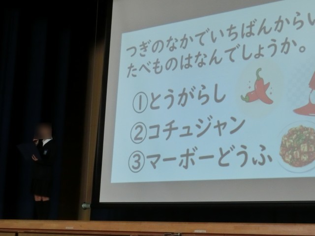 給食や、食べ物についてのクイズや、世界のいろいろな給食の紹介がありました。