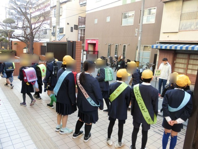 運営委員会の人たちが、登校する児童たちに