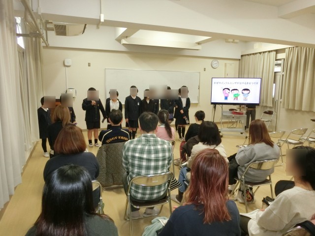 全校児童への啓発活動を楽しく進めている一年間の取り組みの様子を発表しました。