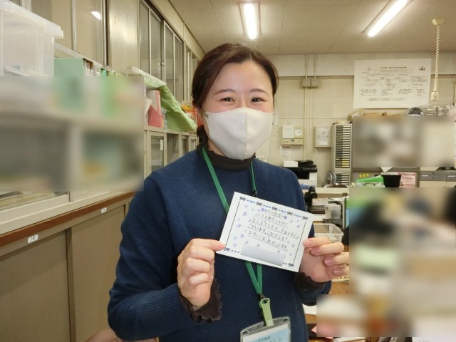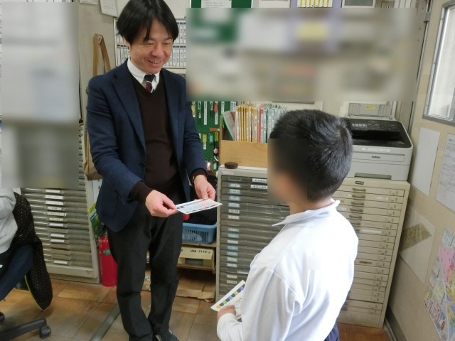 校長先生、教頭先生、亘先生が児童からカードをもらって