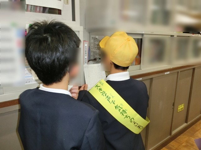 登校時間に、放送で全校児童に「元気よくあいさつしましょう。」と呼びかけています。