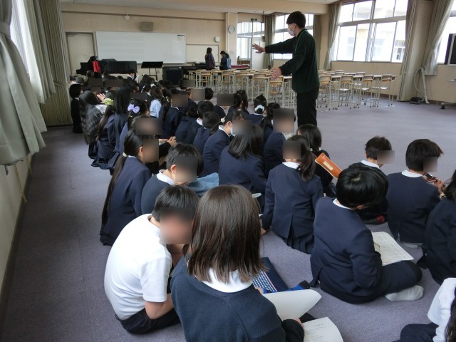 今日の5限目は、4年生の3クラス合同で音楽がありました。