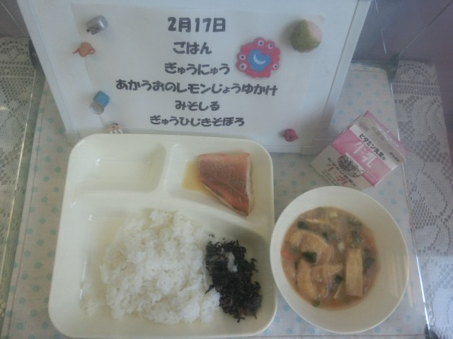 2月17日の給食は「ごはん、牛乳、赤魚のレモンじょうゆかけ、みそ汁、牛ひじきそぼろ」でした。赤魚は、とても好評な献立でレモンじょうゆのソースが人気でした。レモン:うすくちしょうゆ:水で2:1:1の割合のソースを作り、そこに、少しみりんを加えて煮立てて作っています。ぜひ、お家でもお試しください!