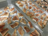 2月19日の給食は「ごはん、牛乳、豚肉と干しずいきのみそ煮、五目汁、焼きじゃが」でした。「ずいき」は、さといもの茎の部分で、干しずいきは、それを干したものです。とても珍しい食材で、給食では、年1回登場します。水で戻してよく洗い、みそ煮にしています。コリコリした食感がおいしく、好評でした。