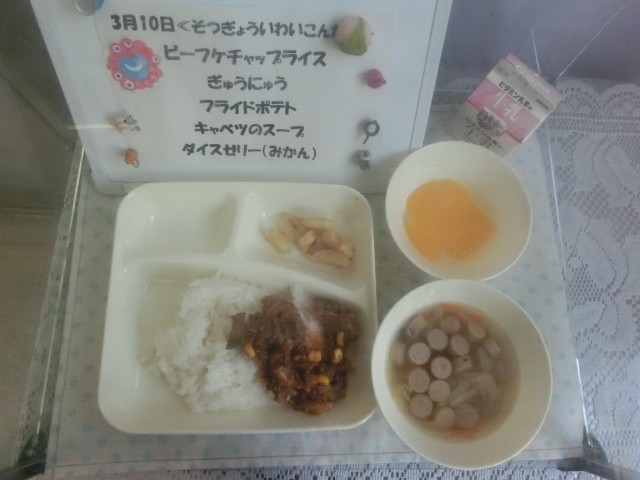 3月10日の給食は卒業お祝い献立で「ビーフケチャップライス、フライドポテト、キャベツのスープ、ダイスゼリー(みかん)」でした。いつもの給食より1品多い献立で、楽しみにしていた人も多かったようです。デザートにゼリーもついて、みんな大満足なようでした。6年生のみなさん、中学生になっても給食しっかり食べてくださいね❣