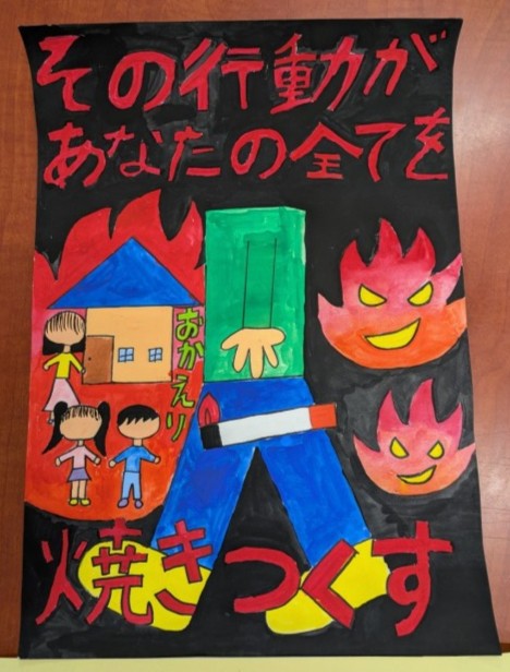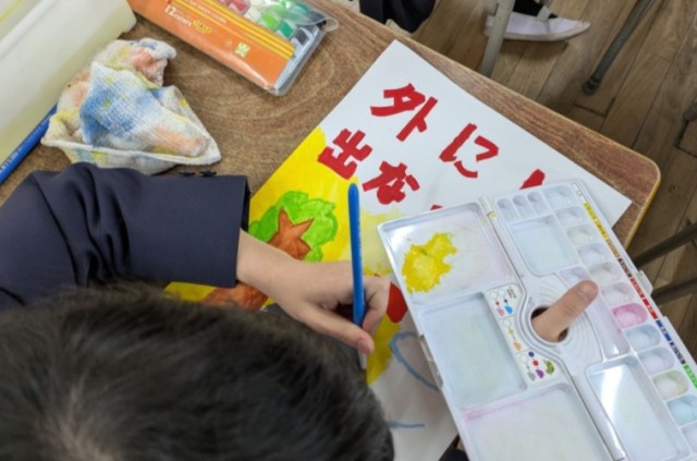 図工の学習で、防災ポスターを描いています。総合の学習で調べたことや聞いたことを振り返りながら、防災について意識してもらえるように工夫して描いています。
