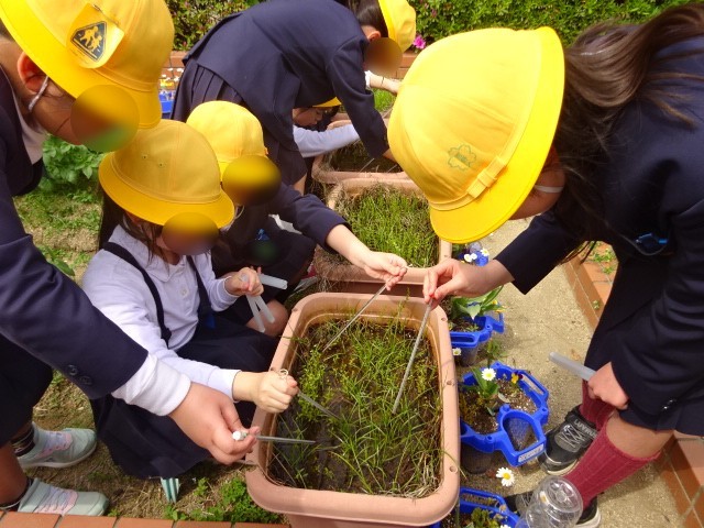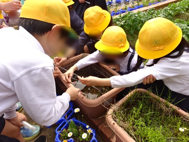 理科の時間に「春の生き物」の学習をしました。学習園に行って、植物の観察をしました。温度計の使い方も練習しました。いろいろな種類の生き物や植物を見つけて楽しそうでした。