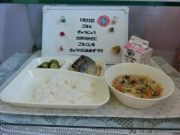 今日の献立は、 ・さばのみそ煮 ・五目汁 ・きゅうりの甘酢づけ ・ごはん ・牛乳...