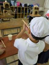 のこぎりを使って作品を作ります。普段からのこぎりを使っていらっしゃる管理作業員さ...
