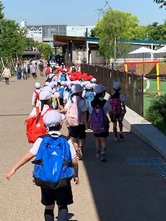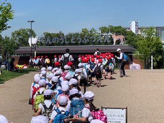 5月8日水曜日、今日は、涼しい風が吹く中天気にもめぐまれ、素晴らしい遠足日和となりました。こどもたちは、野田駅から電車に乗って、車窓からの景色を楽しみながら、天王寺動物園に到着しました!