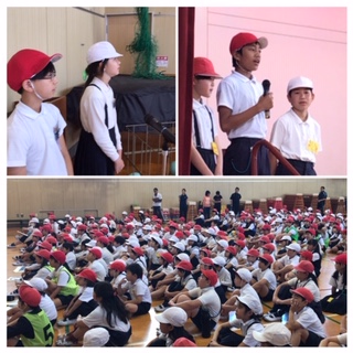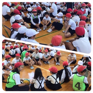本日は、講堂で児童集会が行われました。縦割り班のメンバーでゲームをしました。児童集会委員のゲーム説明をしっかり聞いて、ゲームに取り組みました。
