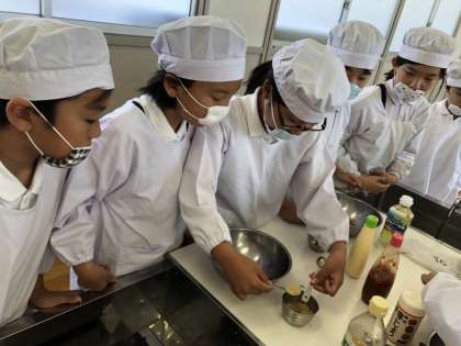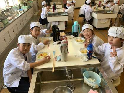今日は、5年生の調理実習でゆで野菜サラダをつくりました。決められた役割をみんなが懸命にやりとげ、安全に実習をやりとげることができました。美味しいサラダの完成です!